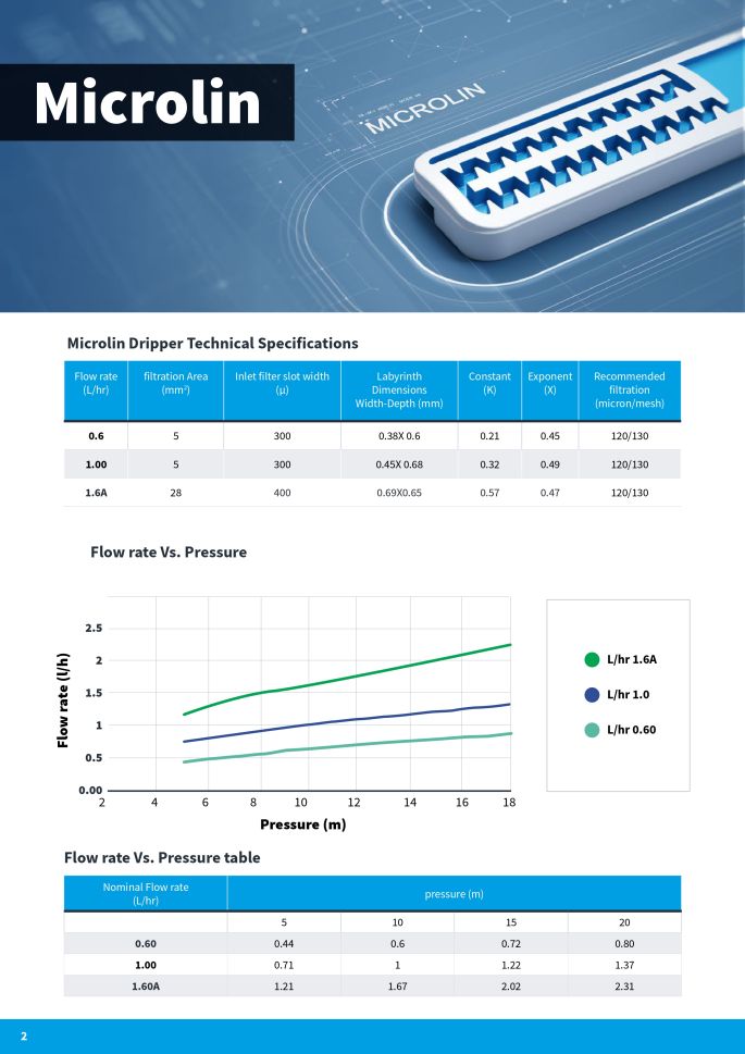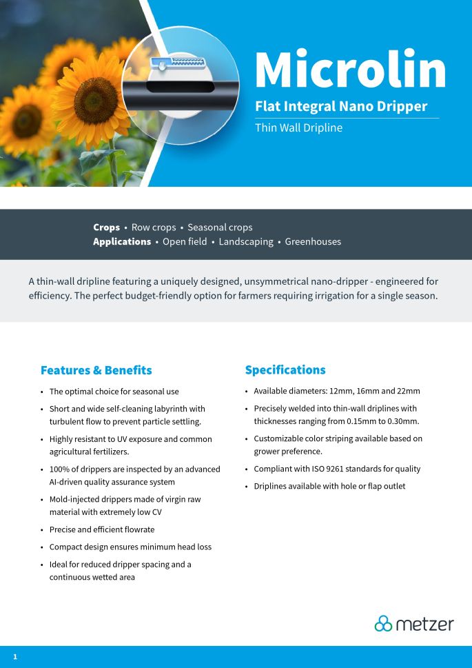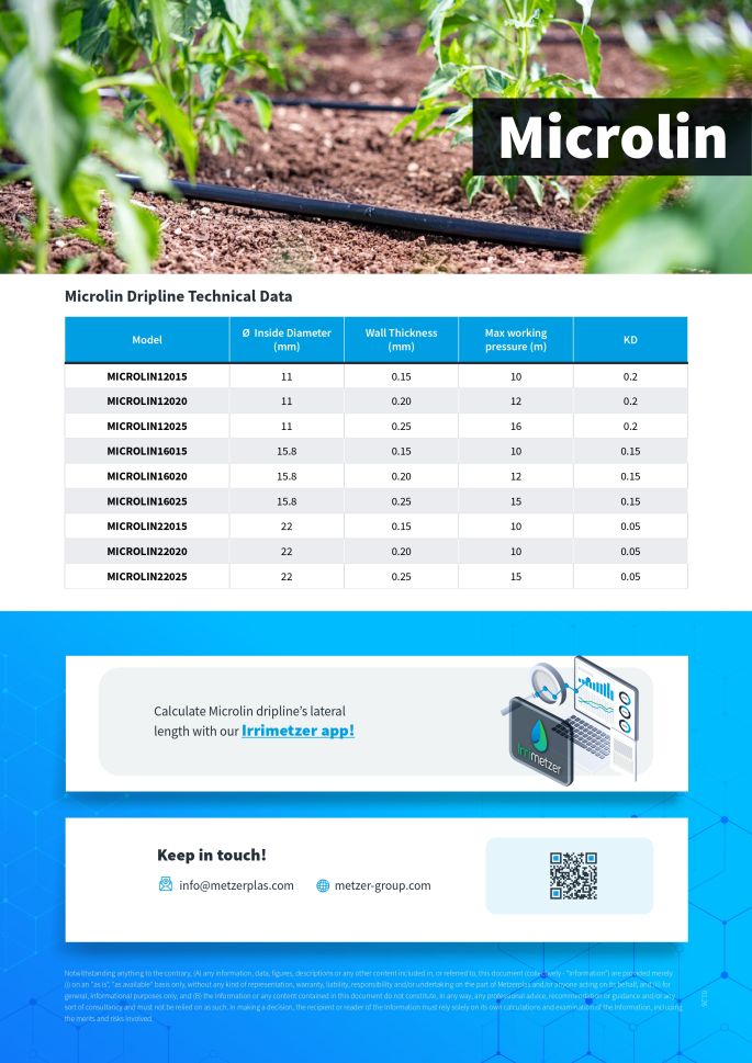 Едносезонна капкова тръба, произведена от израелската фирма Metzer с интегриран плосък капкообразувател Micro Lin. Дебелина на стената - 6 mil, диаметър - 16мм, капкообразуватели - през 20 см, дебит - 0.65 л/ч, дължина на ролка - 3200м., 0.036 Евро за един линеен метър