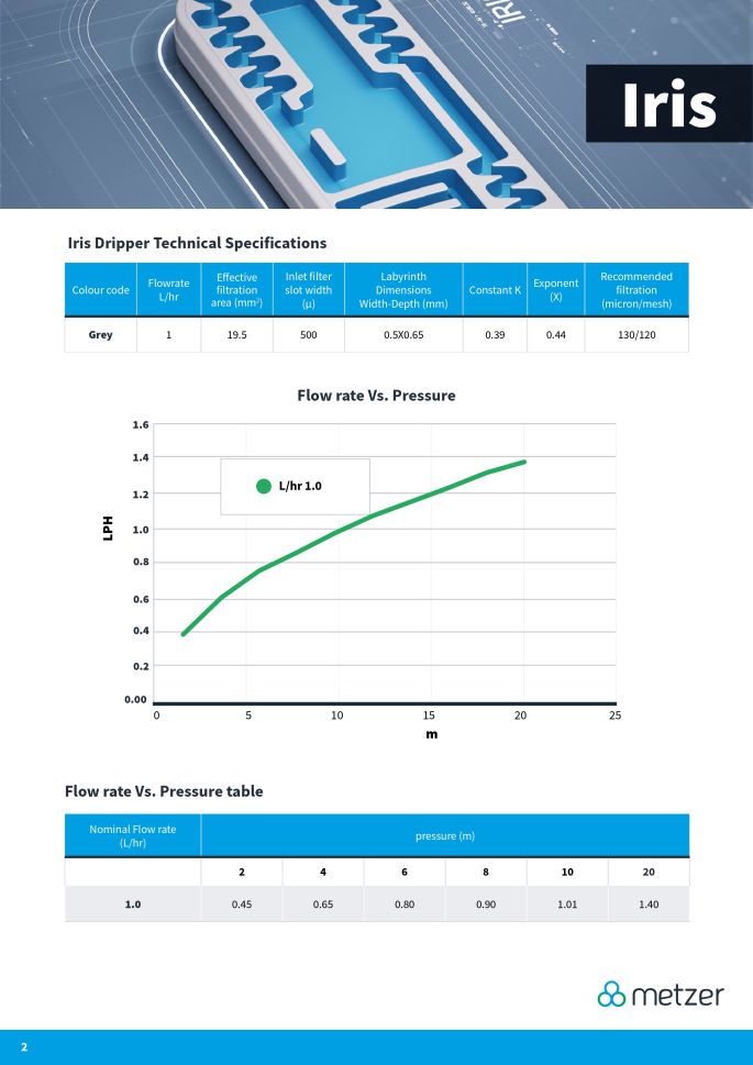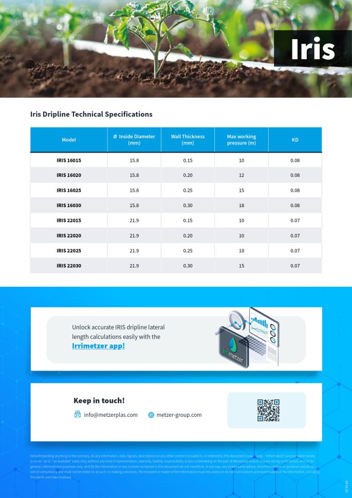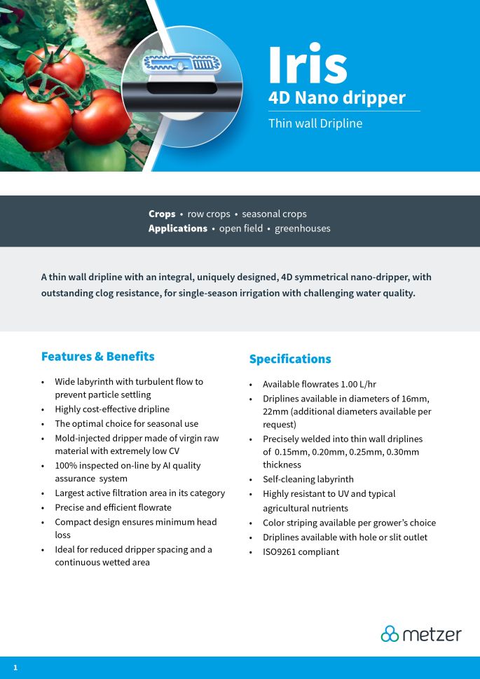 Едносезонна капкова тръба, произведена от израелската фирма Metzer с интегриран плосък капкообразувател IRIS. Дебелина на стената - 6 mil, диаметър - 16мм, капкообразуватели - през 20 см, дебит - 1 л/ч, дължина на ролка - 3200м.0.035 Евро с ДДС за един линеен метър